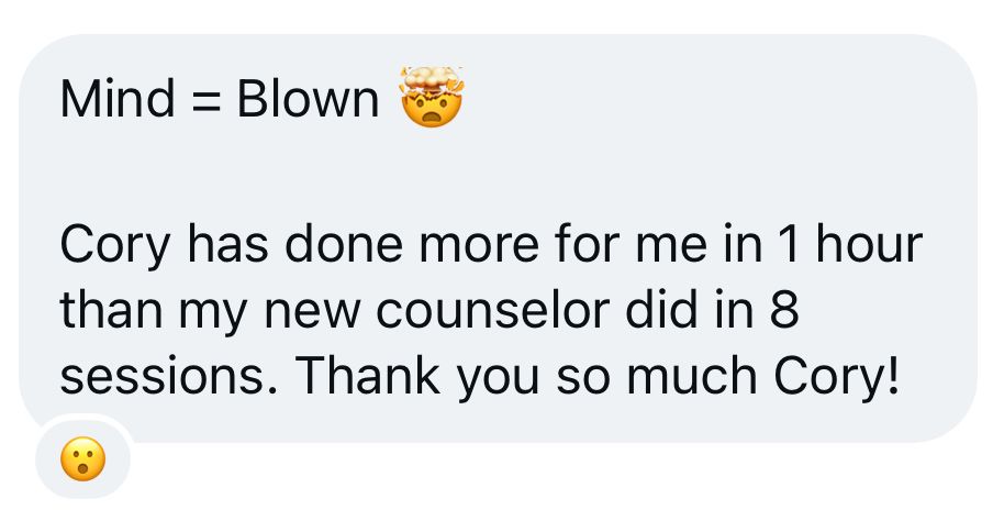 When I booked my call with Cory I was at the end of my rope. I had read countless books, tried two different types of support group, listened to podcasts, left and came back a few times, and none of it had worked.